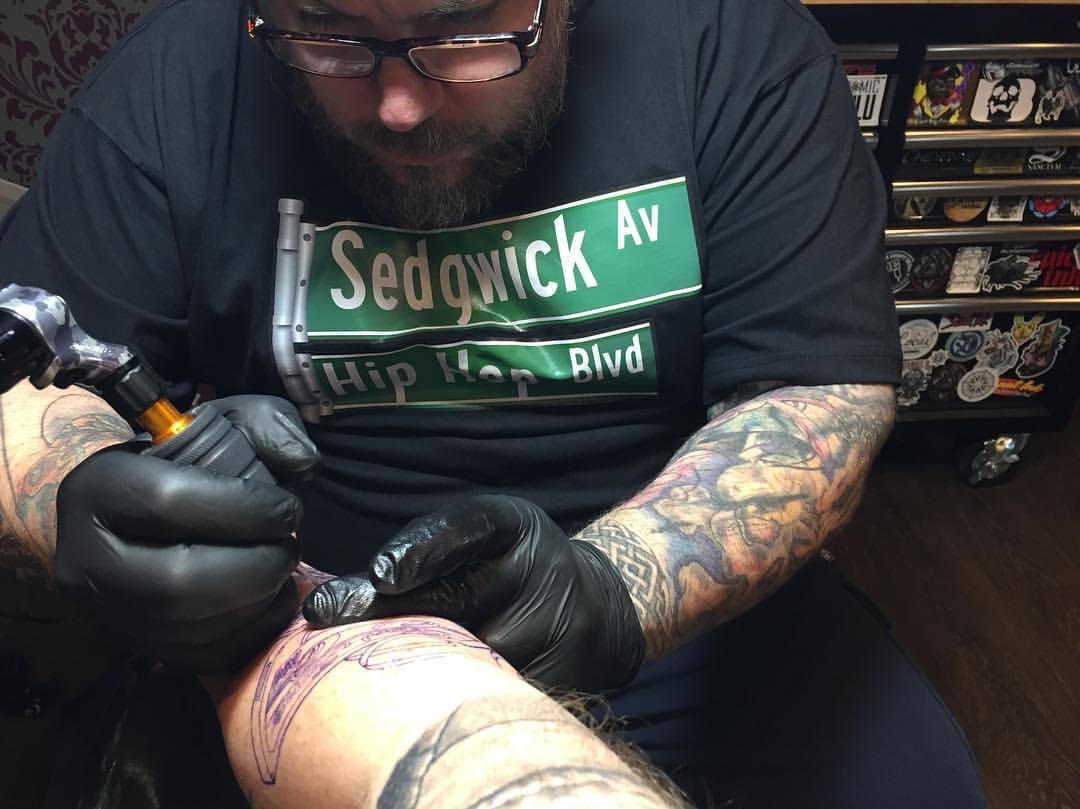 Artist Jay Eakin In the Hip Hop Blvd Tee Putting Some Ink on DJ Renz